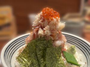 イクラ、マグロ、中落ち、海老、つぶ貝、ミル貝、イカ、数の子、きゅうり、長ネギがタワーのように積まれ、華やかなビジュアルです。